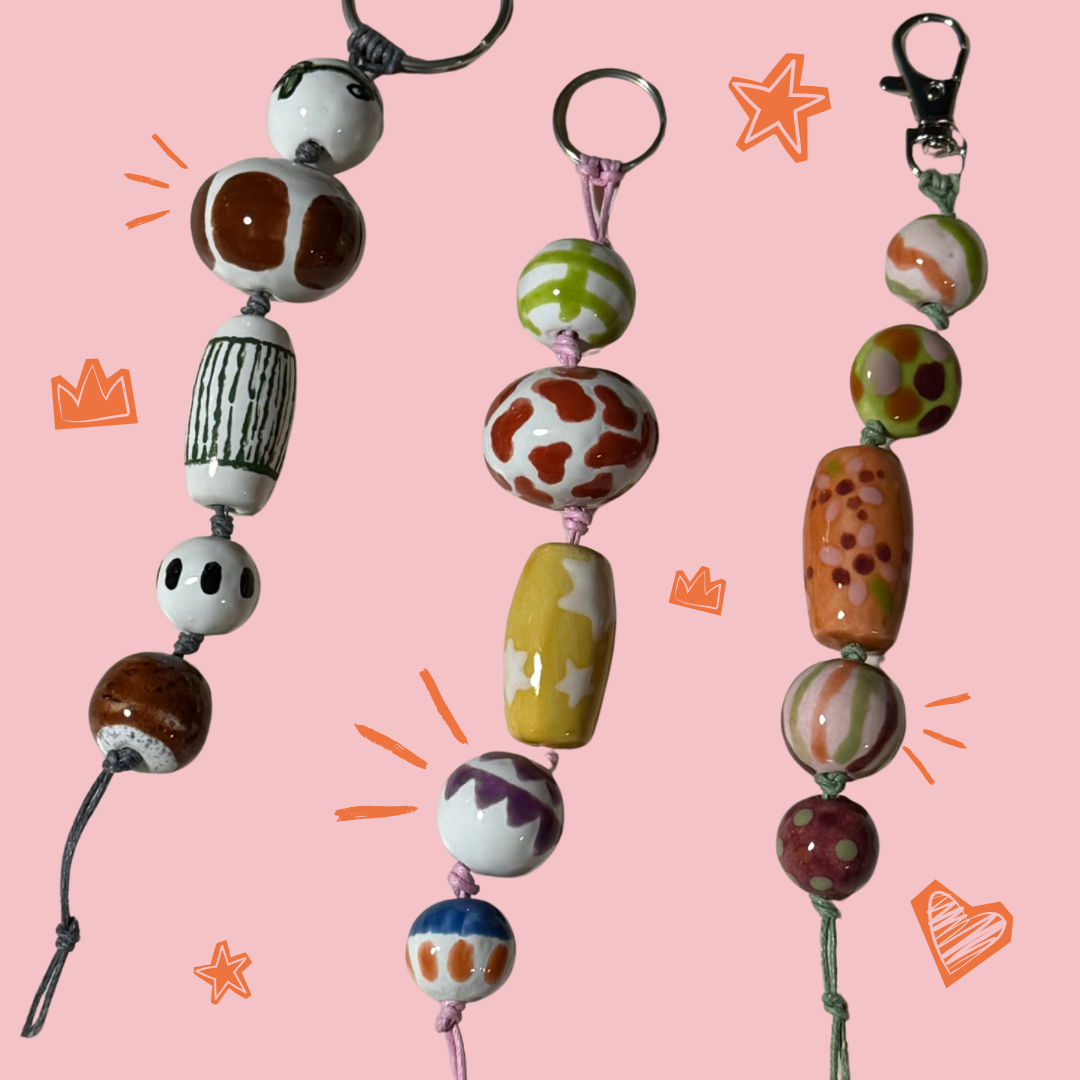 Wir bemalen gemeinsam unterschiedliche Keramikperlen. Stelle deine eigene Kombination aus unterschiedlichen Formen und Grössen zusammen.